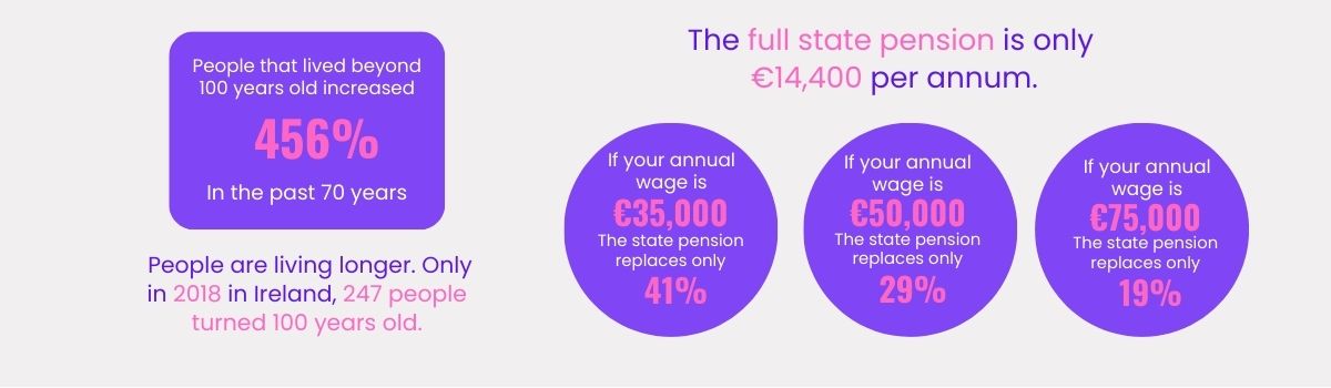 As of today, the State Contributory Pension is about €240 per week. For most people, during their 20-30 years of retirement, this simply isn’t enough. When you pay into a pension plan, you will receive both the state pension (If available to you) and your Pension Plan.